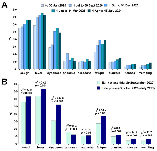 (A) Frequency of early COVID-19 symptoms presented by patients hospitalized in different periods of the pandemic (n = 5199) and (B) comparison in symptoms frequency between the early and late phase of the pandemic.
