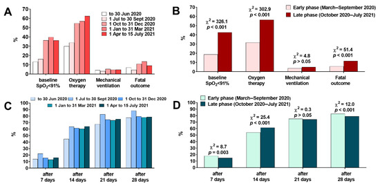 During the entire studied period, the share of patients with SpO2 < 91% at admission and requiring oxygen therapy was 32.5 and 46.1%, respectively, although their share increased since 1 October 2020 (Figure 3A). Compared to the late pandemic phase, the early phase of the pandemic had a significantly lower percentage of patients with SpO2 < 91% at admission requiring oxygen therapy. The overall percentage of patients requiring mechanical ventilation was 4.5%, with no difference between the early and late phases of the pandemic. The fatality rate in the studied period was 9.2% and increased significantly from 5.8% in the early pandemic phase to 11.6% in the late phase (Figure 3B). Men had higher odds for SpO2 < 91% (OR (95%CI) = 1.5 (1.3–1.6, p < 0.001), oxygen therapy (OR (95%CI) = 1.4 (1.3–1.6, p < 0.001) and mechanical ventilation (OR (95%CI) = 1.5 (1.2–2.0), p = 0.003), but not higher odds of death (OR (95%CI) = 1.1 (0.9–1.4, p > 0.05)). Clinical improvement, defined by a reduction in the score of at least 2 points on the ordinal scale, was less frequently recorded in the first period of the pandemic (March–July 2020), especially in the seven days and 14 days follow-ups (Figure 3C,D).