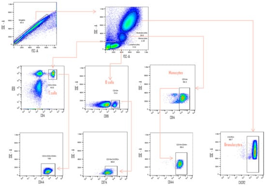 Multicolored labeling was performed using the following corresponding monoclonal antibody panel: CD3 (APC/Cy7 anti-human CD3 Antibody Cat. 300426. Biolegend), CD4 (Alexa Fluor® 488 anti-human CD4 Antibody Cat. 300519. Biolegend), CD14 (PE/Cy7 anti-human CD14 Antibody Cat. 325618. Biolegend), CD19 (PerCP/Cy5.5 anti-human CD19 Antibody Cat. 302230. Biolegend) for the identification of cellular subpopulations. In addition, labeling of CD74 (anti-human PE CD74 Antibody Cat. 326808. Biolegend), CD44 (APC anti-human CD44 Antibody Cat. 338806. Biolegend), CXCR2 (PE anti-human CD182 (CXCR2) Antibody Cat. 320706. Biolegend), CXCR4 (APC anti-human CD184 (CXCR4) Cat. 306510. Biolegend), and CXCR7 (APC anti-human CXCR7 Antibody Cat. 391406. Biolegend) isotype control IgG antibodies conjugated with the same fluorochromes were used as a negative control (Biolegend Inc., San Diego, CA, USA). To accurately identify CD74, CD44, CXCR2, 4 and 7 positive events, the fluorescence minus one experiment was included as an additional negative control. Samples were analyzed in the acoustic focusing Attune® NxT flow cytometer (Life Technologies., Carlsbad, CA, USA). The data obtained were analyzed using FlowJo software v10.0 (TreeStar, Inc., Ashland, OR, USA). First, lymphocytes were gated according to their forward scatter (FC), and side scatter (SS) characteristics. Then, further gates were placed around CD3+ CD4+ T cells, CD19+ B cells, CD14+ monocytes, and granulocytes; subsequently, canonical and non-canonical receptor expression was evaluated. The gating strategy to perform these experiments is shown in Figure 1.