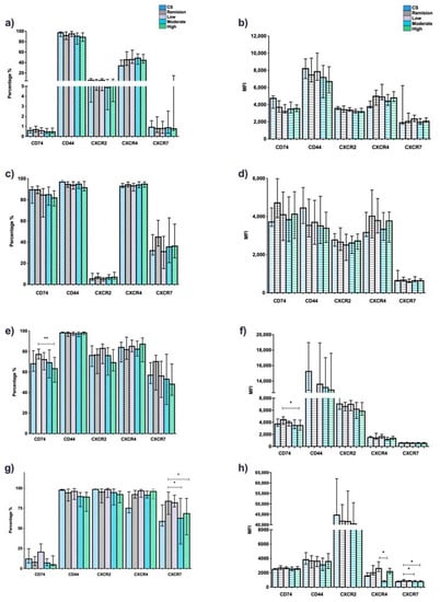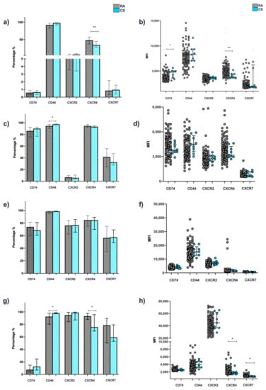 For granulocytes (Figure 2g,h), a higher expression (percentage and MFI) of CXCR4 was found in patients with RA compared to CS (p < 0.05).