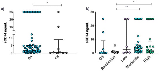 Serum CD74 levels were quantified in patients with RA (n = 71) and CS (n = 9). Higher levels were observed in RA patients than CS (p < 0.05) (Figure 4a). According to disease activity, evaluated by the DAS28-ESR, patients with moderate and high disease activity had higher levels than those in remission (p < 0.01 and p < 0.05, respectively) (Figure 4b).