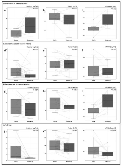 Figure 2. Changes in D-dimer, factor Xa, and circulating cell-free DNA (cfDNA) levels after recurrence of stroke in patients with cancer stroke (ac) and the use of enoxaparin (df) or edoxaban (gi) in patients with cancer stroke and atrial fibrillation stroke (jl).