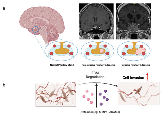 (a) Pituitary gland located in the sella turcica shown in coronal sections as normal pituitary gland, benign pituitary adenoma, and as invasive pituitary adenoma. Internal carotid arteries adjacent to the pituitary are depicted as red circles. Cavernous sinuses are depicted in light blue. Note that aggressive PAs tend to circumvent the arteries. (b) Cellular mode of invasion into the brain tissue depends on degradation of extracellular matrix (ECM) molecules by proteinases of the metzincin family, namely MMPs and ADAMs. All images produced with Biorender (https://biorender.com (accessed on 6 November 2021)).