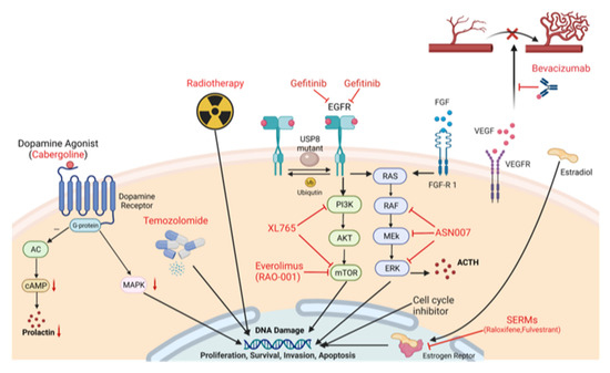 Schematic overview of target proteins and pathways related to the treatment of pituitary adenomas. As general therapeutic approaches, VEGF inhibition with Bevacizumab, EGFR inhibition with gefitinib, the Raf/MEK/ERK pathway by inhibitors such as ASN007, mTOR pathway inhibition with Everolimus and XL-765 as well as chemotherapy with radiation or temozolomide are discussed. As a more specialized therapy, application of dopamine agonists such as Cabergoline and anti-estrogens is the subject of intense research.