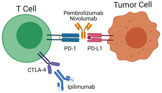 Inhibiting the PD-1 pathway has been proven to be highly effective in lung cancer [122] and melanomas [123] as compared to traditional chemotherapy. CTLA4 is a T-cell located protein that can turn down the immune response in the early phase of tumor development. Thus, using a CTLA4 antagonist could elicit anti-tumoral effects in the early phase of T cell activation (Figure 3) [123].