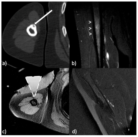Magnetic resonance (MR) is helpful in showing the reactive bone marrow edema around the nidus, demonstrating an increased T2-weighted signal intensity. This is of paramount importance when looking for the nidus that can be extremely small and difficult to find even on the CT [6].