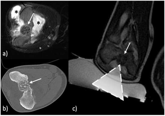 - Napoli, A.; Mastantuono, M.; Cavallo Marincola, B.; Anzidei, M.; Zaccagna, F.; Moreschini, O.; Passariello, R.; Catalano, C. Osteoid osteoma: MR-guided focused ultrasound for entirely noninvasive treatment. Radiology 2013, 267, 514–521. [Google Scholar] [CrossRef]
