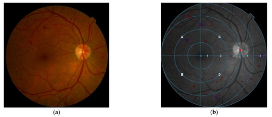 The 2iRetinex software (patent number RPI201499900601833) extracted different features from the retinographies. Specifically, 2iRetinex extracted the vascular tree through the isolation of the green channel and microaneurysms and hemorrhages (which are candidates for lesions by applying structural characteristics), through analysis of the dark residual objects. In addition, the 2iRetinex software superimposed a binary mask on the green layer of the images, which made it possible to locate the optic disc. Using a filter also highlighted the bright lesions (exudates and cotton spots). Furthermore, it was able to detect the position of the macula. Finally, a topographic reference system was established to locate the lesions by coordinates. After checking that the image was suitable for analysis, the original image (Figure 1a) was transformed into the resulting image shown in Figure 1b.