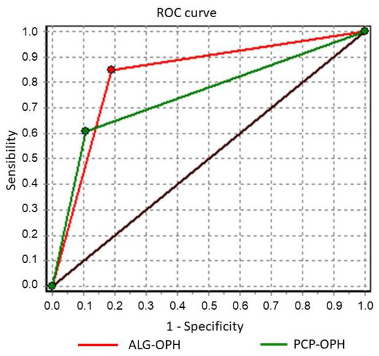 The AUC for the PCP showed a value of 0.75, while for the ALG was 0.8287. We found that there was a significant difference between the two curves (Chi-square value 28.0575, p = 0.0000). Consequently, these results shown in Figure 3 indicate a greater diagnostic power of the ALG.