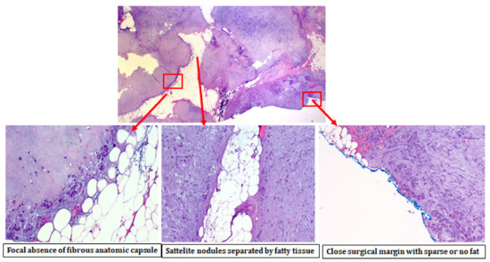 Our comparative analysis showed that parapharyngeal pleomorphic adenomas are characterized by a lower presence of an intact anatomical capsule and a remarkably more frequent occurrence of satellite nodules (Figure 1, Table 2). Table 3 shows the comparative analysis of several satellite nodule-specific characteristics (number, distance from main lesion) between the two study groups.