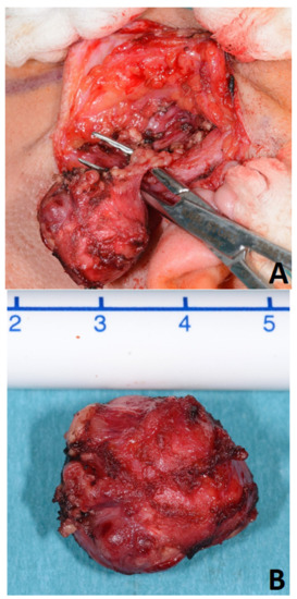 Extracapsular dissection (A) of a pleomorphic adenoma of the parotid gland (B).
