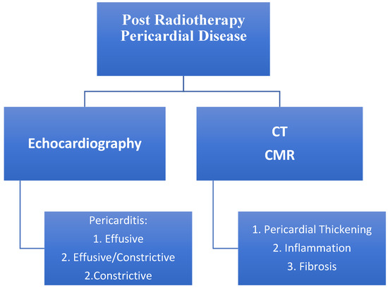 Evaluation of pericardial disease in patients who underwent radiotherapy. Abbreviations: CT: computed tomography; CMR: cardiac magnetic resonance [61,63,64].