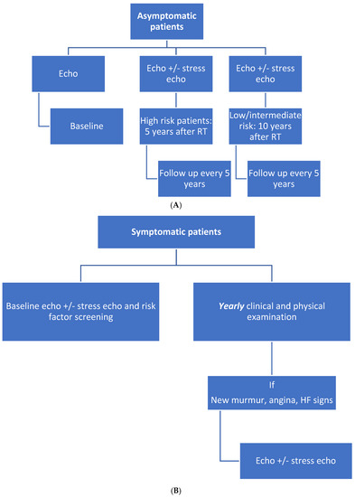 (A) Algorithm for management of asymptomatic patients after chest RT. (B) Algorithm for management of symptomatic patients after chest RT. [3] Abbreviations: Echo: echocardiography; HF: heart failure.