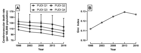 Consistent with global trends, the death rate due to CeVD has declined in Japan over the past two decades (Figure 2A). The declining trend of the CeVD death rate was parallel for each quartile by the PUDI. The mean and SD of the CeVD death rate (per 100,000 population) in 1998, 2003, 2008, 2013, and 2018 were 108.4 (22.5), 123.3 (24.8), 117.5 (24.7), 114.5 (25.3), 108.3 (25.0), and 100.8 (23.1), respectively. However, the nationwide disparity in CeVD death rates, as indicated by the Gini index, increased over the 20 years (Figure 2B).