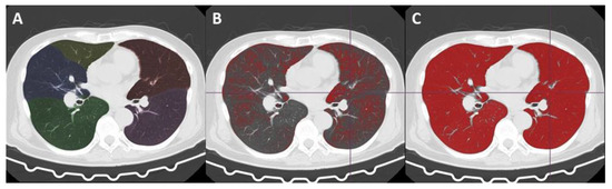 Second, using a lung analysis tool for automatic whole lung extraction from the chest, CT images were taken excluding the thoracic wall, mediastinum, large vessels, pleural effusion, and airways (from the trachea to tertiary bronchi) (Figure 2A–C).