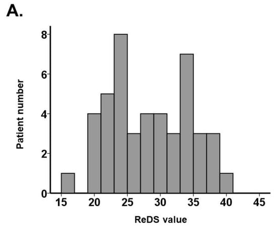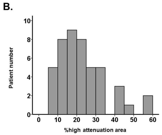 A total of 46 hospitalized patients were included (Table 1). The median age was 76 (73, 84) years old, and 28 (61%) subjects were men. The median body mass index was 21.6 (19.7, 26.0). The distribution of ReDS values and %high attenuation area are shown in Figure 3A,B. The median ReDS value was 28% (23%, 33%), and the median %high attenuation area was 21.6% (14.4%, 28.5%).