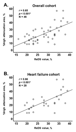 The ReDS value was an independent predictor of %high attenuation area after adjusting for two potential confounders (body mass index and plasmas B-type natriuretic peptide) (p < 0.001; Table 2).