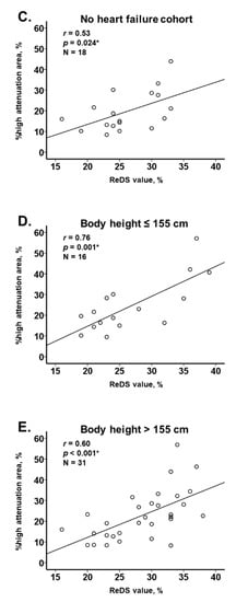 Correlation between ReDS value and %high attenuation area among all cohort (A), those with and without heart failure (B,C), and those with and without body weight ≤155 cm (D,E). * p < 0.05 by Pearson’s correlation coefficient.