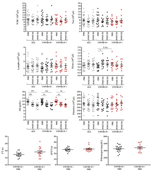 Hematological and coagulation parameters in overall (ALL, grey), COVID-19 − (black) and COVID-19 + (red) patients with lower limbs fractures registered pre- (PRE), day 1 (POST D1) and day 2 (POST D2) post-surgery. Mean with SEM are showed. * p ≤ 0.05, ** p < 0.02, *** p < 0.001.