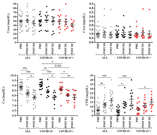 No changes in urea and creatinine levels were observed neither during the first two days after surgery nor between groups. Calcium levels decreased from pre-surgery to day 1 and day 2 post-surgery in all groups (8.8 ± 0.5 mg/dL pre-surgery, 8.2 ± 0.5 mg/dL day 1 post-surgery, 7.8 ± 0.6 mg/dL day 2 post-surgery for all patients, p < 0.0001; 9.0 ± 0.4 mg/dL pre-surgery, 8.4 ± 0.5 mg/dL day 1 post-surgery, 7.8 ± 0.5 mg/dL day 2 post-surgery for COVID-19 −, p < 0.0001; 8.6 ± 0.6 mg/dL pre-surgery, 8.0 ± 0.4 mg/dL day 1 post-surgery, 7.8 ± 0.6 mg/dL day 2 post-surgery for COVID-19 +, p < 0.001). Lower levels of calcium were observed in COVID-19 + patients pre-surgery (p = 0.02) and day 1 post-surgery (tendency, p = 0.06) in comparison with COVID-19 – subjects; these values became similar on the second day after surgery.