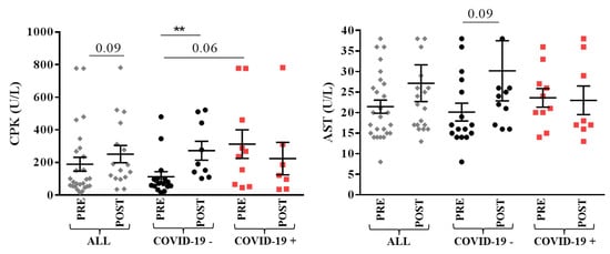 Muscular markers creatine phosphokinase (CPK) and aspartate aminotransferase (AST) showed post-surgical increase in COVID-19 − group (112.5 ± 124.4 U/L pre-surgery, 272.6 ± 173.7 U/L day 1 post-surgery, p = 0.002 and 20.1 ± 8.6 U/L pre-surgery, 30.2 ± 24.3 U/L post-surgery, tendency p = 0.09, respectively). For these markers, COVID-19 + patients showed higher pre-surgical levels which remained high post-surgery (Figure 3).