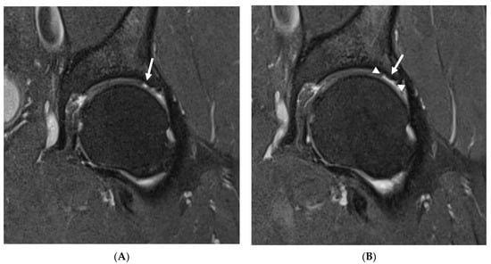 To objectively assess the effect of an intervention on the disease process, imaging techniques are used along with clinical parameters []. Although magnetic resonance imaging (MRI) is not routinely employed for OA diagnosis, in recent years it has been increasingly used for research and clinical trials. The advantages of MRI, besides providing a direct visualization of articular cartilage, are related to an excellent soft tissue contrast that allows a whole-joint assessment in OA []. The recognition of OA as a disease that affects all structures of the joint resulted in the introduction of scoring systems for the assessment of degenerative changes across the hip joint [,,]. MRI-based semi-quantitative systems of OA severity assessment are recommended for clinical trials by the Osteoarthritis Research Society International (OARSI) []. The scoring hip osteoarthritis with MRI (SHOMRI) is an exemplary tool with high construct validity and inter-observer agreement that evaluates articular cartilage loss, bone marrow edema pattern (BMEP), subchondral cysts, labral abnormalities, joint effusion, loose bodies, and ligamentum teres abnormalities [,]. Using arthroscopic correlation, SHOMRI grading of the hip proved to be a valid and precise method to assess chondrolabral abnormalities []. Additionally, SHOMRI has been used for the longitudinal assessment of OA progression, and a correlation between some of the assessed parameters (namely BMEP and subchondral cysts) and functional evaluation parameters has been demonstrated [].