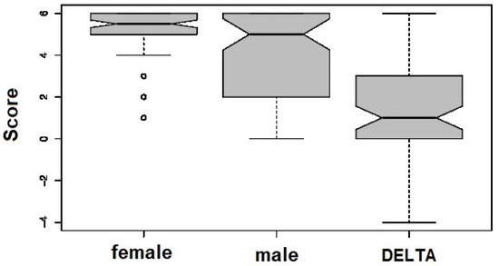 Box plot representation of the FSS differential response between male and female patients with ME/CFS treated with O2-O3-AHT.