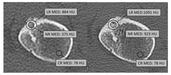 Pathological fractures are a quite common periprocedural complication after ablative procedures on bone metastases, regardless of the ablation technique employed, due to the usually massive weakening of the bone caused by the pathological tissue; nevertheless, there are few studies reporting bone complications in interventional treatments on benign bone lesions. Measuring a few cubic millimeters or centimeters, the size of the treated volume of these lesions can hardly justify a pathological fracture. Some reports describe fractures as a complication occurring after RFA of benign lesions [9] and, also in the authors’ experience, one case of post-RFA fracture, conservatively managed and healed, in a 20-year-old man with an osteoid osteoma located in the transverse process of a thoracic vertebra, was observed. This potential periprocedural risk, together with damage of soft tissues, critical structures, and skin, due to hyperthermia, represents a real possible complication in the therapeutic strategy. In a previous paper, nevertheless [1], the authors describe a progressive sclerotic process of the nidus of osteoblastomas treated with RFA. In another study [10], based on a larger series of lesions (Osteoid Osteomas) treated with RFA and MRgFUS, the authors also demonstrate bone remodeling with ossification. In particular, the authors set 12 months after treatment as the optimal time for follow-up to see the initial signs of ossification. To our knowledge, however, in the literature, there is no assessment of bone modifications in vivo after ablation of OB and OO, which, conversely, have been observed in swine models [11,12]. Also, quantitative evaluations of the bone segment treated have never been made. The purpose of this study was an objective quantification of post-treatment bone changes accompanying morphological CT modifications. To evaluate the strength of the bone, we decided to calculate the bone density of the focal lesion (the nidus) before and after treatment. Measurements were performed only in patients ablated with MRgFUS, to avoid confounding factors that would result by the presence of the needle tract in the bone. A statistically significant bone densification was observed following MRgFUS ablation, both in OO and OB, at the nidus as well as at the perilesional level. We evaluated the normal bone density values of physiological bone near the lesion and noticed that these measurements also varied in the follow-up studies, without reaching statistical significance. This phenomenon was probably related to the normal growth and mineralization of bone in young patients. When the values describing density modification before and long after the procedure were compared, they showed a statistically significant difference, which supports the thesis that a successful treatment can destroy the pathological tissue and induce a restitutio ad integrum of the affected bone segment (Figure 5, Figure 6 and Figure 7). This phenomenon is particularly evident in these kind of lesions, due to their usually osteolytic nature. The lack of significant statistical differences between the areas of NR and LR before and after treatment means that, although the segmentation was manually performed, it was accurate and the results were reliable.