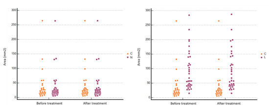 Accuracy of manually traced nidus ROIs (NR) and Lesion ROIs (LR) when compared to Control ROIs (CR) both on pre and post-treatment evaluation. There were no statistically significant differences in ROIs’ area measured (two-factor ANOVA with repeated measures on one factor, CI = 95%) on pre and post-treatment CT examinations. Y axis: ROIs’ area (C: Control ROI area; L: Lesion ROI area; N: Nidus ROI area).