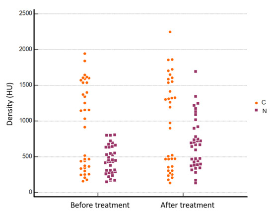 Bone density values at nidus level (NR) before and after MRgFUS treatment (452.75 ± 195.31 HU and 688.14 ± 362.45 HU, respectively, treatment*time interaction p < 0.001, estimated with two-factor ANOVA with repeated measures on one factor, CI = 95%). Y axis: bone density; N: nidus ROI; C: control ROI.