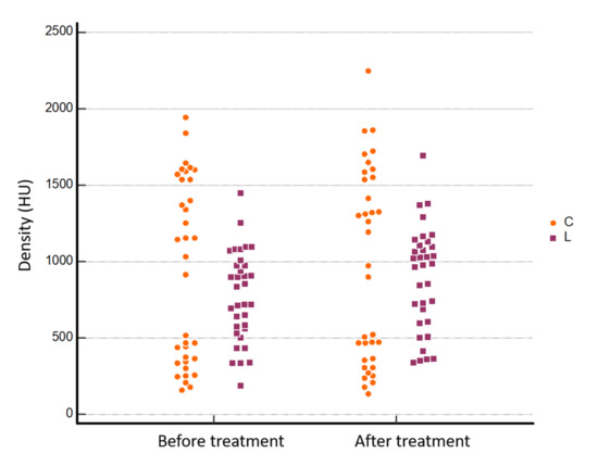 Bone density values at lesion level (LR) before and after MRgFUS treatment (770.50 ± 293.99 HU and 890.91 ± 338.09 HU, respectively, treatment*time interaction p = 0.010, estimated with two-factor ANOVA with repeated measures on one factor, CI = 95%). Y axis: bone density; L: Lesion ROI; C: control ROI.