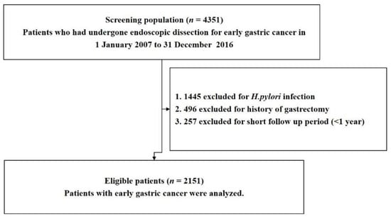 This was a retrospective cohort study of patients registered at the Samsung Medical Center, Seoul, South Korea. Patients who underwent endoscopic resection for EGC between January 2007 and December 2016 (n = 4351), and who were followed up until 30 April 2020, were included. Patients with (1) H. pylori infection, (2) a history of gastrectomy during the study period, and (3) a follow-up duration of less than 1 year were excluded. The number of patients who met the criteria was 2151 (Figure 1). The study protocol was approved by the Ethics Committee of Samsung Medical Center (IRB No. 2021-02-147-001). This study was conducted in accordance with the principles of the Declaration of Helsinki. As this study used only de-identified data routinely collected during hospital visits, the requirement to obtain informed patient consent was waived.