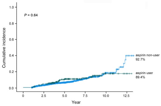 With a median follow-up of 5 years (interquartile range, 3.5–6.2), 176 (7.7%) patients developed MGC. Except for age, no other clinical variables, including aspirin use, were significantly associated with the cumulative incidence of MGC. The tumor characteristics, including tumor size, location, and macroscopic type, were significant (p < 0.1) in the univariate analysis. However, no independent predictors were identified in the multivariate analysis. Marginal differences were observed according to tumor location (p = 0.082, Table 2). A subgroup analysis of the factors associated with MGC is shown on Supplementary Materials Table S1, and no significant factor was found. The cumulative incidence of MGC was 89.4% in aspirin users and 92.7% in non-users, but the difference was not statistically significant (p = 0.64, Figure 2).