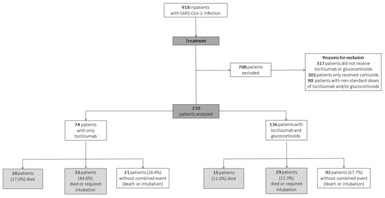 Flowchart of patient selection according to hospital protocol. Patients were included in the tocilizumab and glucocorticoid group if they received at least 125 mg of intravenous methylprednisolone (or dexamethasone equivalent) for 2 to 5 days and one or two doses of intravenous tocilizumab.
