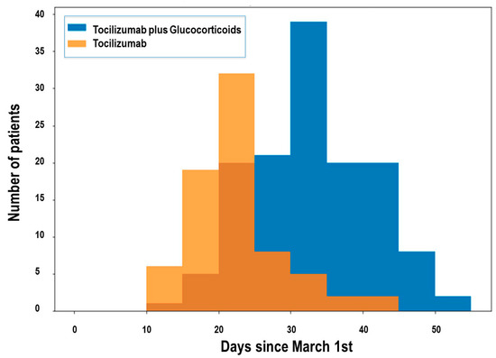 Between 1 March and 23 April 2020, 918 patients were admitted to the University Hospital of Salamanca because of severe COVID-19 with PCR-confirmed infections. Of them, 74 patients received only TCZ, and 136 patients received TCZ and high-dose corticosteroids (126 received MPD and 10 received dexamethasone; Figure 1). The choice of treatment changed with the date of admission, according to modifications in our hospital protocol (Figure 2).