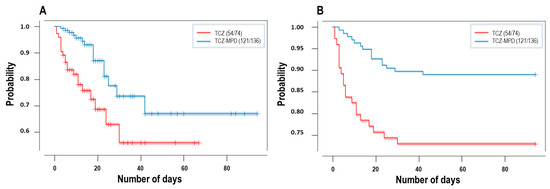 A total of 20 patients died (27%) in the TCZ group and the combined event of death and need for invasive mechanical ventilation occurred in 33 patients (44.6%), whereas 15 patients died (11%), and 29 patients died or required intubation (21.3%) in the MPD-TCZ group. These improved outcomes in the MPD-TCZ group were significant after univariate analysis (p = 0.006 for mortality and p < 0.001 for severity in favor of the MPD-TCZ group). Survival analysis and Kaplan–Meier curves also showed a significant effect (p = 0.002) of MPD-TCZ in mortality (Figure 3).