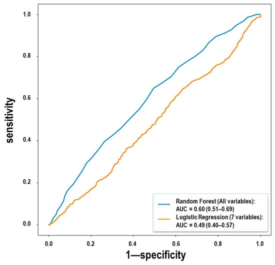 Receiver operating characteristic curves of the different classification algorithms for treatment difference, including best classifier (random forest with all variables) and logistic regression with 7 variables for comparison. The model with all variables was able to show statistically significant differences between both treatment groups but the model constructed with the 7 clinically relevant variables according to the COVID-19 Salamanca Risk Score did not find differences.