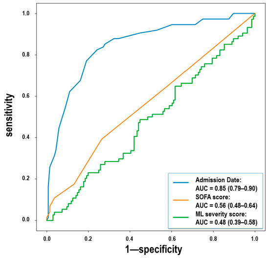 In addition, we compared whether the date of admission was more relevant than prognostic scores to differentiate between treatment groups. Figure 5 shows the ROC curves for the SOFA score, machine learning severity score, and date of admission, when used to distinguish between both treatment groups, showing no discriminant power for the first two and great discriminant power for the latter. Therefore, we confirmed that the date of admission was a significant variable potentially impacting outcome differences between treatment groups.