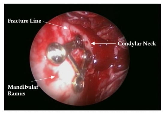 - Sandler, N.A. Endoscopic-assisted reduction and fixation of a mandibular subcondylar fracture: Report of a case. J. Oral Maxillofac. Surg. 2001, 59, 1479–1482. [Google Scholar] [CrossRef] [PubMed]