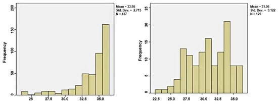 Distribution of gestational age in the two groups; (a) the distribution of gestational age in group 1; (b) the distribution of gestational age in group 2.