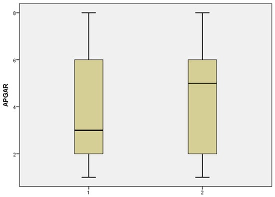 Distribution of Apgar score values in group 1 without latency vs. group 2 with latency, in case of gestational age between 24–27.