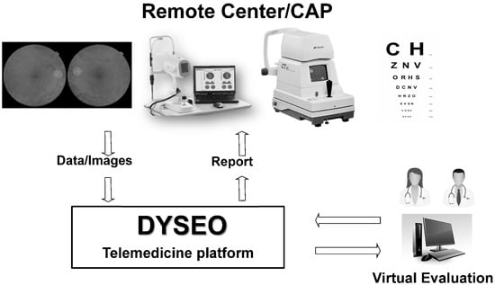 Telemedicine scheme. At the primary care center (remote center), patients were examined, and data were uploaded to the DYSEO platform. Images and data were remotely evaluated and reported on a deferred basis.