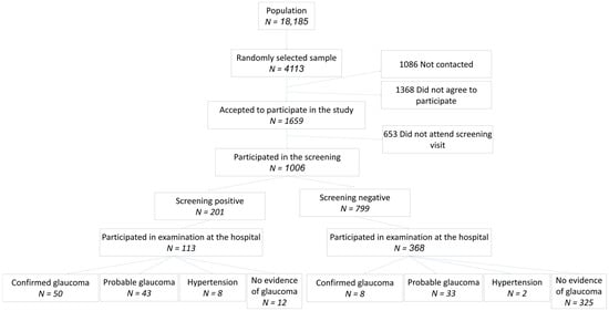 The random selection resulted in a list of 4113 individuals, but only 1006 (24.5%) were finally examined at the screening center (Figure 1). The demographic characteristics of the sample are summarized in Table 1 and described in more detail elsewhere []. The distribution between genders reflected the slightly larger number of females than males in the population, and approximately 40% were aged 55–64 years and 65–74 years, respectively, while 20% of the sample was older than 74 years. A total of 61 (5.1%) persons had been previously diagnosed with glaucoma, and 102 (10.1%) had a family history of glaucoma (Figure 2).