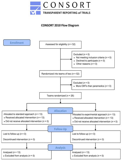 Fifty-two participants were recruited (44 paramedics and 8 EMTs) between March and May 2021. They were divided into 26 teams allocated equally to both groups (Figure 2). Their characteristics are detailed in Table 1. All were analysed by original assigned groups.