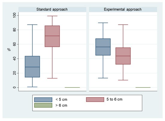 Applying the experimental approach led to shallower compressions with a difference higher than 0.6 cm (median (Q1; Q3) 4.6 cm (4.3; 5.0) versus 5.2 cm (4.9; 5.3), p = 0.007). Accordingly, the mean proportion of compressions within the depth target (5 to 6 cm) was lower in the experimental group (41.7% (95% CI 28.2–55.3) versus 66.5% (95% CI 51.5–81.4), p = 0.01). All out-of-target compressions were too shallow, as there was no value above target (> 6 cm) in either group (Figure 3).