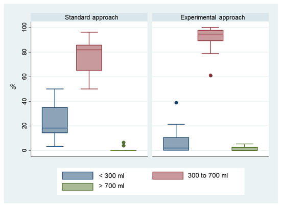 The total number of ventilations over the 10 min scenario was more than twice as high in the experimental group (mean 39 (95% CI 33–46) versus 19 (95% CI 16–23), p < 0.001), corresponding to a higher minute ventilation (median (Q1; Q3) 2374 mL/min (2134; 2672) versus 794 mL/min (689; 1285). The proportion of ventilations within target volume was also significantly higher in this group (median (Q1; Q3) 94.6% (88.9; 98.0) versus 81.8% (65.0; 85.7), p = 0.003) (Figure 4).