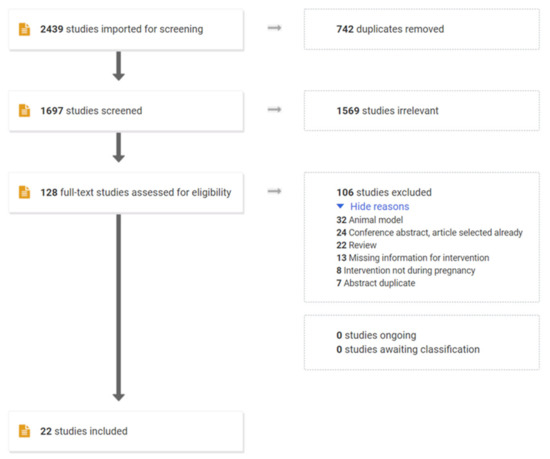 The search strategy (Figure 1) identified 2439 articles. After removing duplicates (n = 742), 1697 papers were screened based on their title and abstracts. 1569 papers were excluded based of irrelevant to the question, exposure not during pregnancy and IL-1 blockade effects were not reported. On this basis, resulting in 128 papers for which full text was evaluated. 106 studies were excluded as they were reviews, conference abstract with original article already included, missing information or reports of animal studies, meaning 22 papers were included in the final synthesis. The 22 included studies were 9 case reports, 13 cohort studies (6 retrospective and 7 prospective).