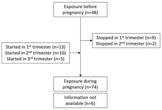 In 48 cases (60.0%) of the remaining 80 pregnancies, the women were already taking the medication prior to getting pregnant; in 6 cases, this was unknown. In 50 cases (62.5%), the drug therapy was continued throughout pregnancy (when it was started either prior to or during the first trimester until birth). In nine cases, treatment was stopped after the first trimester and, in 2 cases, after the second trimester, due to the lack of data on safety of these drugs in pregnancy. In 13 cases, treatment was started either during the second half of pregnancy (10 patients) or during the third trimester (3 patients). Of these 13 cases, 4 were due to a lack of improvement with their previous treatment (i.e., colchicine or prednisone), 2 women were diagnosed with AOSD or HLH while pregnant and no information was given for the remaining seven women. Details of the treatment duration is shown in a flow chart (Figure 2). Information concerning each pregnancy separately are shown in Table 2.