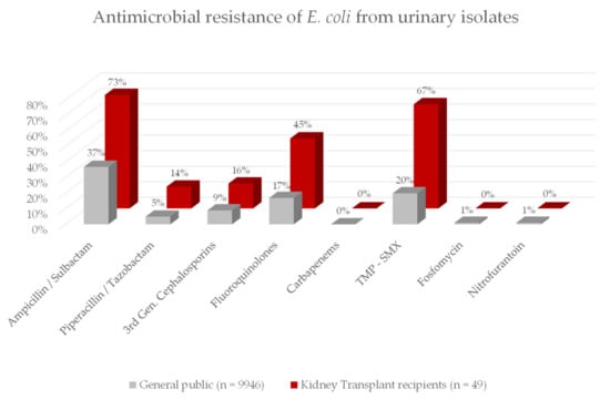 - Brakemeier, S.; Taxeidi, S.I.; Zukunft, B.; Schmidt, D.; Gaedeke, J.; Dürr, M.; Hansen, S.; Budde, K. Extended-Spectrum Beta-Lactamase-Producing Enterobacteriaceae-Related Urinary Tract Infection in Kidney Transplant Recipients: Risk Factors, Treatment, and Long-Term Outcome. Transpl Proc. 2017, 49, 1757–1765. [Google Scholar] [CrossRef]