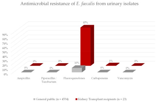 This figure shows the antimicrobial resistance to commonly used antibiotics of E. faecalis in our KT cohort compared to the local general public. While the resistance to betalactam antibiotics is comparable, nearly all isolates in the KT cohort are resistant to fluoroquinolones whereas resistance to fluoroquinolones was uncommon in the general public.